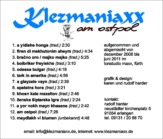 1. a yidishe honga (trad.) 2:30 2. firen di mekhutonim aheym (trad.) 4:34 3. bracno oro / majko majko (trad.) 5:25 4. boibriker freylekhs (trad.) 3:10 5. odessa bulgar (trad.) 4:18 6. terk in amerike (trad.) 4:56 7. a gleyzele vayn (trad.) 2:39 8. epsteins hora (trad.) 3:21 9. khosn kale mazeltov (trad.) 2:46 10. zenska siptarska igra (trad.) 2:24 11. a yor nokh mayn khasene (trad.) 2:42 12. am ostpol (trad.) 7:26 13. meydlakh vi blumen (unbekannt) 4:48 |